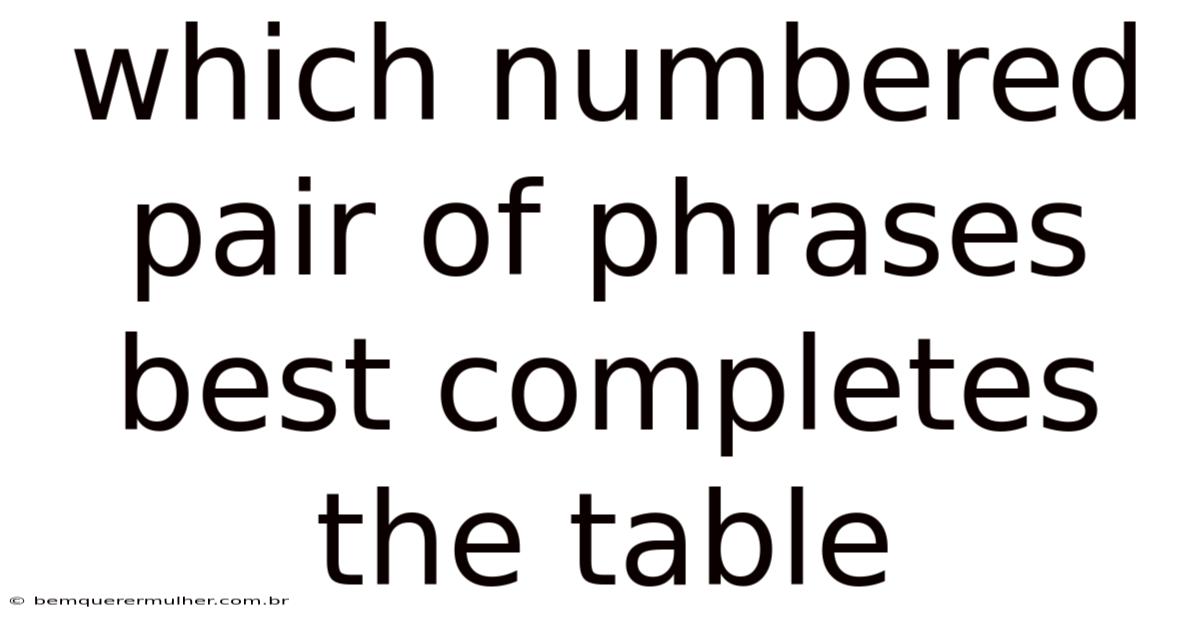 In conclusion, the ability to determine which numbered pair of phrases best completes a table is more than just an academic exercise—it is a fundamental skill that enhances clarity, organization, and logical thinking. Whether you're analyzing data, categorizing information, or solving complex problems, this skill enables you to make informed decisions and draw meaningful connections. By approaching table completion with a methodical mindset, paying attention to context, and practicing regularly, you can sharpen your analytical abilities and improve your overall problem-solving proficiency. Ultimately, mastering this skill empowers you to navigate both structured tasks and real-world challenges with greater confidence and precision.